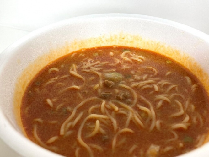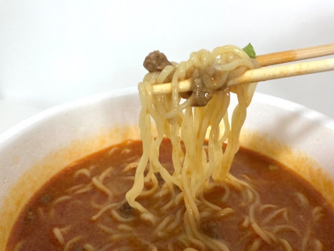 また、注目したいのは具の豪華さ!カップ麺なのにネギとお肉のブロックが大きくて、うまみをしっかりと感じます。花椒の華やかな風味とごまのまろやかなコクがクセになるので、普段はカップ麺のスープを飲み干さない筆者でも、美味しく飲み干してしまいました!刺激が少ないのに豊かな味わいが楽しめる癒し系担々麺、満喫しました。