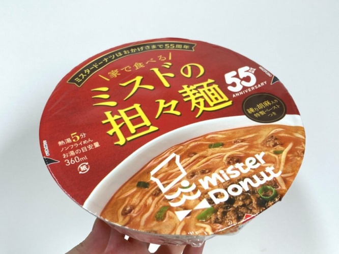 ミスタードーナツは今年で55周年。そんな記念すべき1年に、ミスドの人気飲茶メニューである「四川担々麺」がカップ麺になって誕生しました!ミスドでのカップ麺商品は、2023年に発売し売り切れ続出となった「家で食べるミスドの汁そば」以来の登場なのだとか。今回は『家で食べるミスドの担々麺』の実食レポを、写真たっぷりでお届けします。
