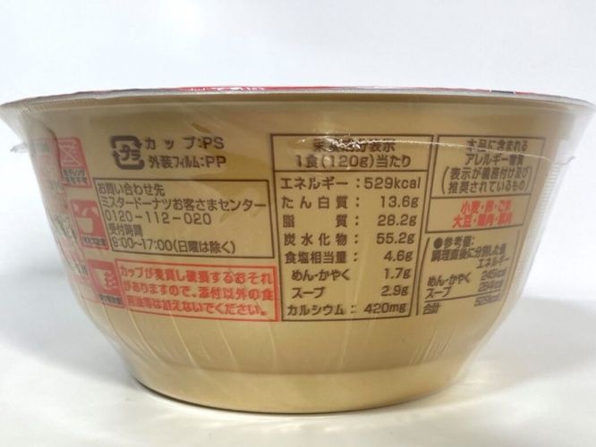 こちらが『家で食べるミスドの担々麺』。テイクアウト専用商品で、390円(税込)でした。1食あたりのエネルギーは529kcal。ミスド店内で食べられる飲茶メニューの「四川担々麺」のエネルギーは、公式ホームページによると554kcalなので、ほとんど同じカロリーとなっています。