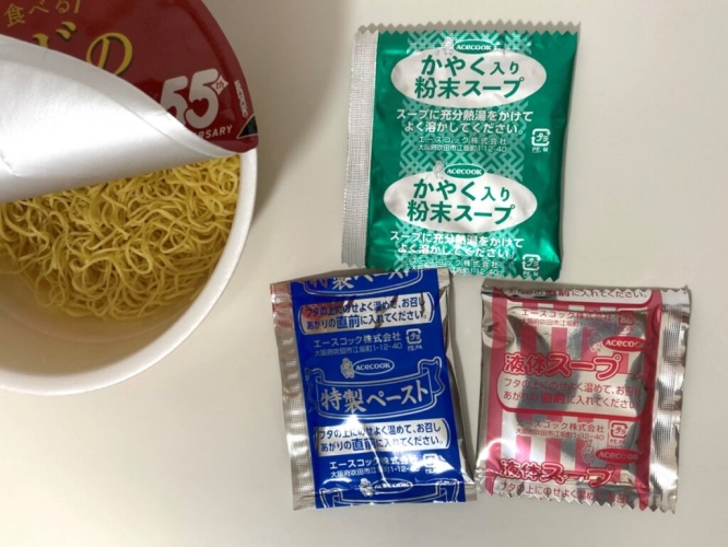 開封すると中に入っていたのは、かやく入り粉末スープ・液体スープ・特製ペーストの3つ。