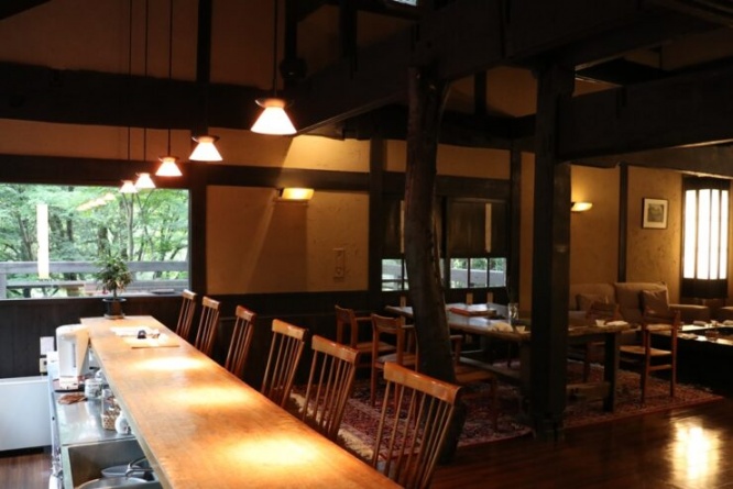囲炉裏やテーブルは梁の材料を加工して作ったもので、囲炉裏は山桜、フロント前のテーブルは欅が使われています。カウンターの一枚板はブビンガという非常に重い外来木材です。