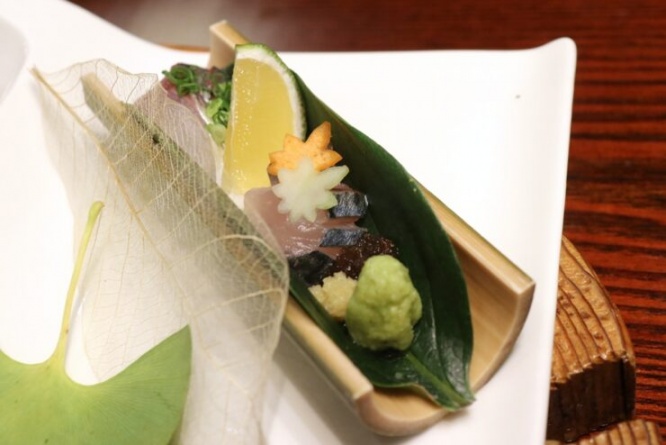 別府港から直送される魚は季節によって変わります。この日は関サバと関アジ、サワラやタイなどが提供されました。刺身のツマには莫大海(ばくだいかい)という珍しい食材(柏樹の木の実を乾燥させたもの)が使われています。味はほとんどありませんが、独特の歯触りがユニークでした。