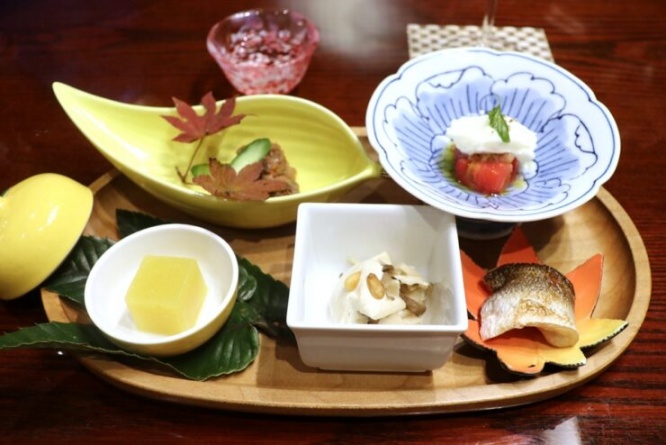 先付けは、カマス若狭焼き、糸瓜羊羹、トマトマリネ、木野子和え、もろみきゅうりと豊後牛。トマトマリネにはマスカルポーネ、ヨーグルト、ブラックペッパー、揚げたバジルがのっていて、手が込んでいます。木野子和えは黒舞茸と白舞茸の白和えで、トリュフと松の実がアクセント。
