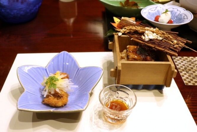 大分県中津市の名物である鱧を使った鱧カツは、黄身じょうゆ、セロリドレッシングでいただきます。長崎県産穴子をもちごめと一緒に蒸した飯蒸しはふっくら、もっちりとしたおいしさです。