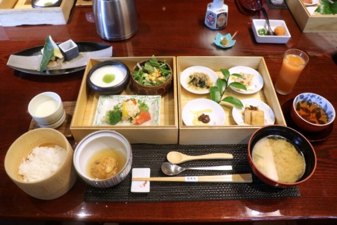朝食も同じくお食事処「月燈庵」でいただけます。目覚めの一杯には、ゆふいん牛乳またはミックスジュース。料理は和定食スタイルで運ばれてきます。