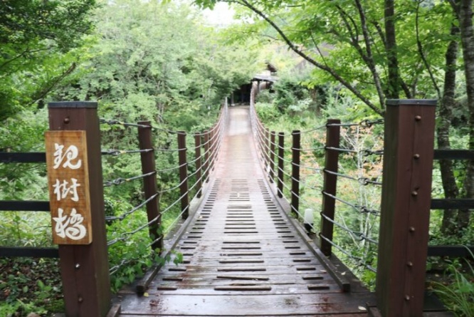 母屋でチェックインを済ませたら、観樹橋と名付けられたつり橋を渡って、宿泊棟へ向かいます。小川に架けられたつり橋は、風を感じ、由布岳を仰ぎ見ることができる最高のロケーションです。夏には蛍、秋には紅葉が訪れる人の目を楽しませてくれます。