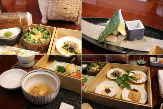 サラダのドレッシングは、かぼす、トマト、玉ねぎ、ごまの4種類からお好きなものを。塩サバ、海苔の佃煮、だし巻き卵、銀餡をかけたひろうす、ほうれん草のお浸し、れんこんのきんぴら、豊後牛肉みそ、大根の漬物と明太子、ポテトサラダ、温豆腐など、品数豊富でご飯が進みました。