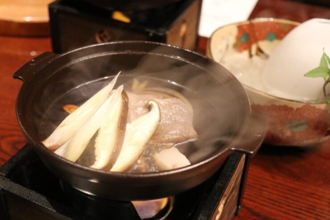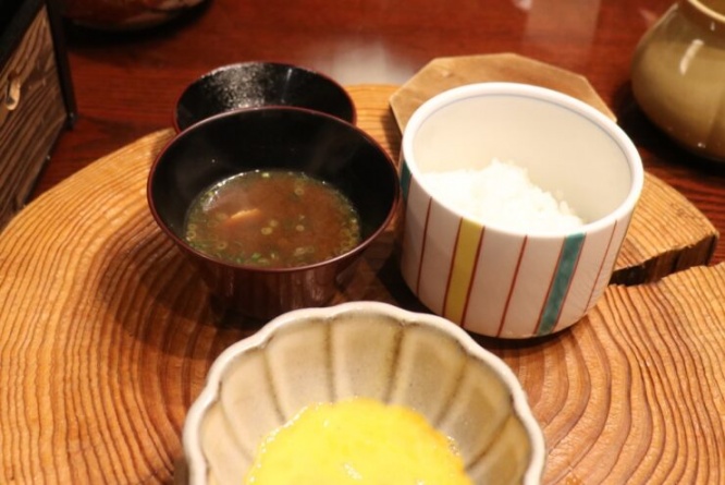 松茸、赤足えび、鶏肉、マナカツオが入った土瓶蒸しが置かれたプレートは、月燈庵を建てる際に伐採した杉林の杉を使ったものだそう。同じ土地で形を変えて大切に使われているのが素敵です。スタッフの方が配膳の際にそうした話もしてくれるので、より一層食事を楽しめました。