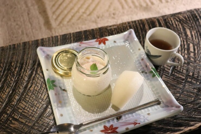 デザートが出されて、コースは終了。おいしいお酒と料理、そしてスタッフのおもてなしに、お腹も心も満たされました。