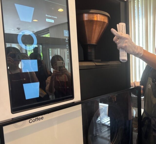 研修では、本社1階にある自社焙煎所を見学することもできました。ここで働くのは「CUクルー」と呼ばれる障がいを持つスタッフ9名で、焙煎から梱包まで一貫して作業を行っています。