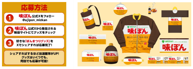 応募期間は2025年11月10日(月)11時10分から12月31日(水)23時59分まで。応募方法は、「味ぽん」公式Xアカウント(@ajipon_mizkan)をフォローし、公式Xの投稿から特設サイトへ遷移、記載の「ぽんまつりグッズ」の応募ボタンを押してXにシェアするだけ。