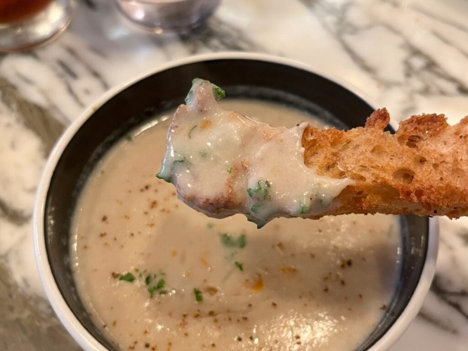 ハードな食感のバケットにチャウダーをしっかりしみ込ませると、風味が絶妙にマッチ!サイドメニューというより、メインとして楽しめる一品です。