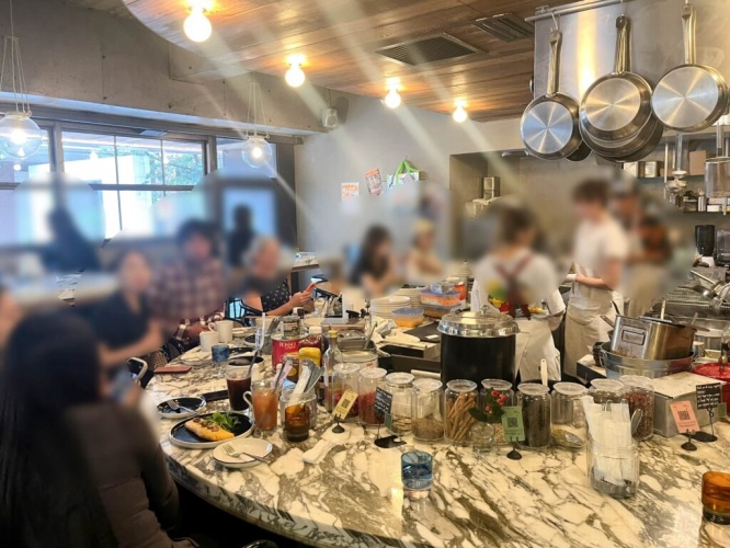 カウンター席の前に置かれた様々な調味料は、実際に調理で使われているよう。調味料のビンなど、一つ一つの小物も素敵で、この雑多な感じがオシャレ。どこか海外のカフェに来たみたいです。ライブ感もあって、待っている間中ワクワクしちゃいます。