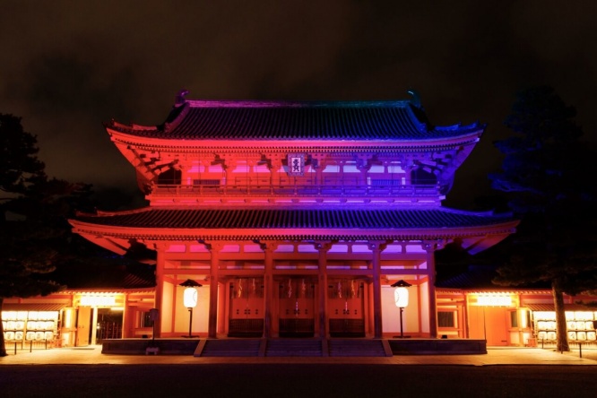 本年の目玉は、約1年半ぶりにお披露目される塗替工事を終えた大極殿。平安神宮の顔とも言える大極殿はかつての平安京の正庁、朝堂院を再現した壮麗な建築。鮮やかな朱色の社殿、碧瓦の屋根、そして両端に輝く金色の鴟尾が見どころです。重要文化財・大極殿が幻想的な光に包まれたなかで参拝できます。
