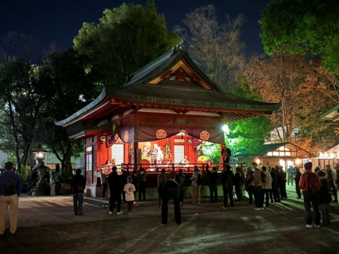 観光客に向けて演じているわけではなく、本殿に向かって幕を開けるので、屋台の後ろからは何が行われているか、ほぼ見えません。筆者は側面から拝見しました。子供がお姫様のいでたちで、簪をしゃらしゃら鳴らして演じていました。