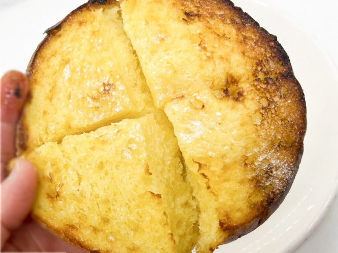 では一口。パンの味わいに、ふわっと卵と牛乳の旨みを感じます。優しい甘さが美味しい!裏も表もよく焼かれていて、香ばしい風味も食欲をそそります。