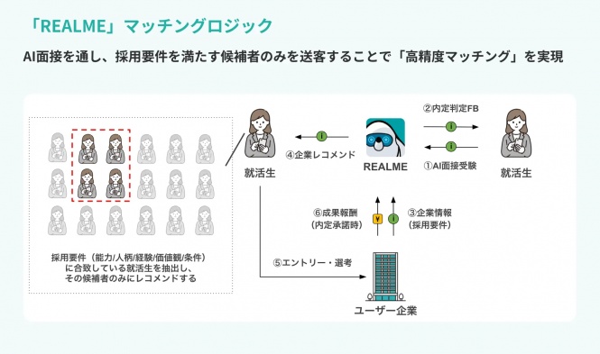 学生がAIと音声で対話しながら模擬面接ができるサービス「REALME」は、自己認知を高める支援を行う。内定獲得確率を可視化できるため、自分の現在地がわかりやすい。受けたい企業が本当に自分に合っているのか、さらには受けるつもりがなかった企業も選択肢に入れることができるため、企業と学生のミスマッチが最小限に。