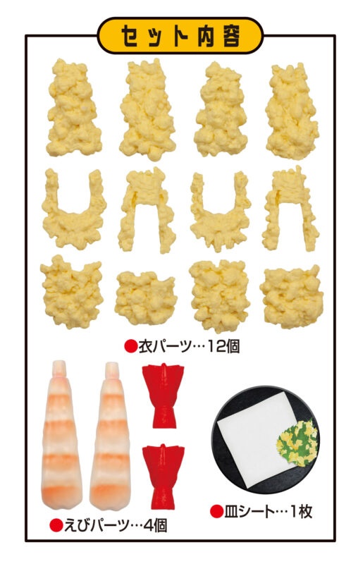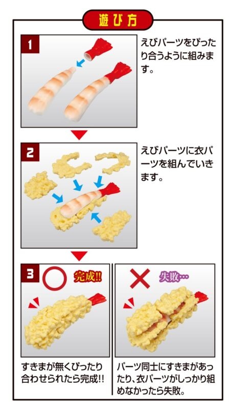 新商品となる『解体パズルLite えび天パズル』は、サクサクの衣パーツ12個、えびパーツ4個を正しく組み合わせてえび天を2本、完成させる立体パズルとなります。
