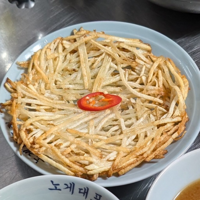 3品目は「ジャガイモのチヂミ」(税込858円)。一般的なチヂミといえば、ニラなどの野菜が入った生地を丸く広げて焼き、カットして提供されるものが主流ですが、テポチのチヂミは見た目から新鮮。じゃがいもをスティック状にし、表面をカリッと焼き上げたスタイル。