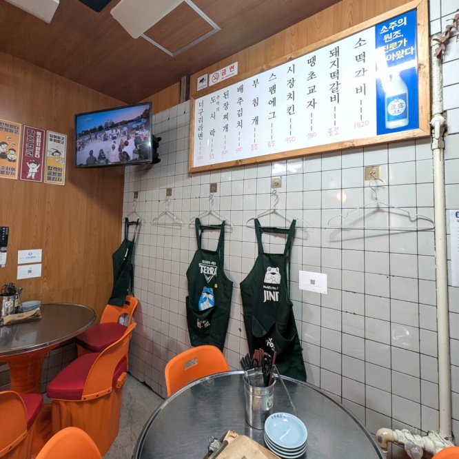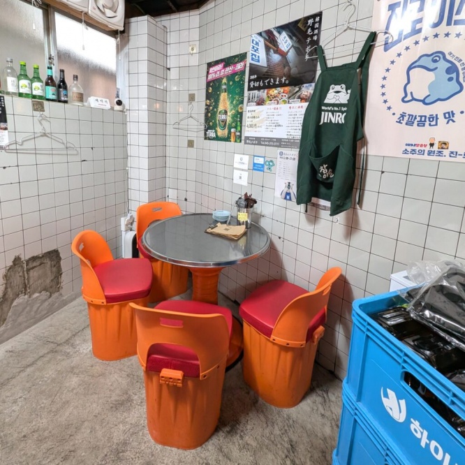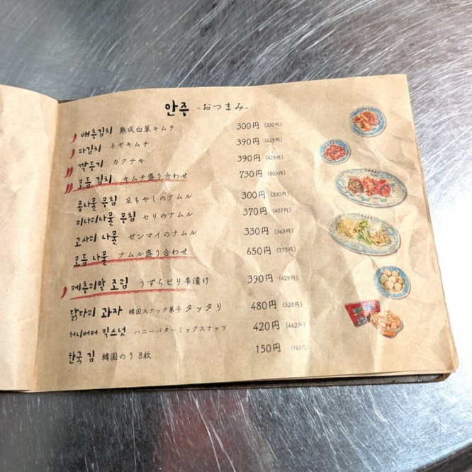店内に入ると、大衆酒場の空気感がそのまま切り取られたような内装で、思わずキョロキョロしてしまうほど。ステンレス製のテーブルや壁の装飾まで、韓国を思わせる要素が随所に散りばめられています。