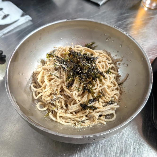 麺を引き上げるとツヤがあり、ひと口すすると驚くほどつるりとしたのど越し。エゴマ油の良い香りがふわっと広がり、韓国海苔と白ごまの風味が重なってコクも感じられます。油を使っているのにしつこさはなく、後味はとても軽やか。マックッスを初めて食べたのですが、家でも作れたらいいのにと思ってしまうおいしさでした。ランチの最初の一皿に選んだのも正解で、一気にテンションが上がります。
