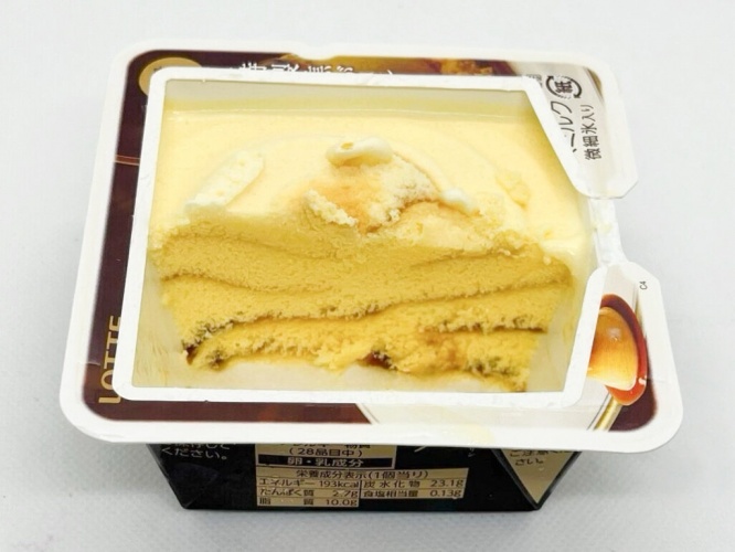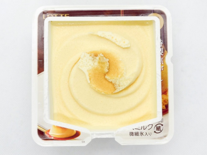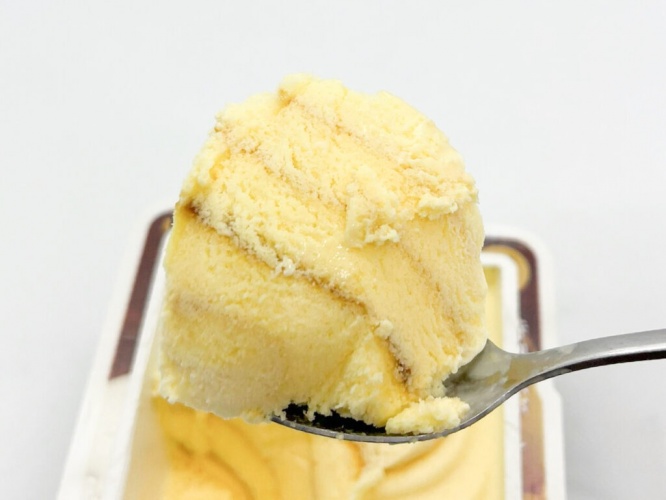 開けてみると、柔らかな黄色のアイスに香ばしそうなカラメルソースが混ぜこまれています。こちらのソースは特製の焦がしカラメルソースとのこと。ふわっとプリンのいい香りが漂い、食欲が刺激されちゃう!