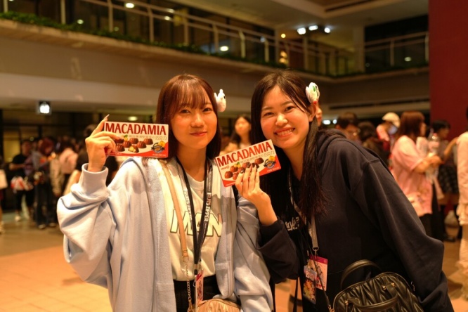 11月8日・9日の上海公演で配られたのは「マカダミアチョコレート」。早瀬ノエルは、中国語パッケージの新鮮さに触れつつ、「海外でも人気だと実感できて嬉しかった。この季節にマカダミアを食べて心温まってほしい」とファンへメッセージを送った。