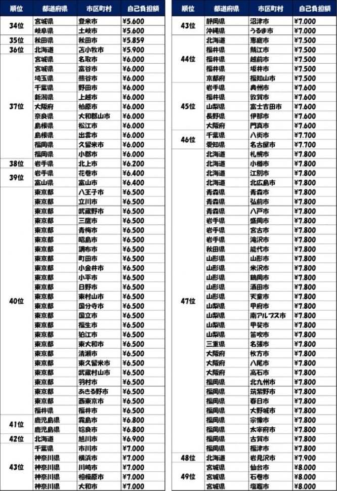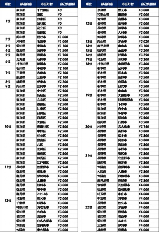 【表:人口5万人以上の自治体 自己負担額ランキング】