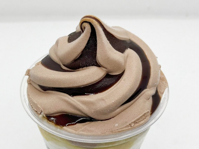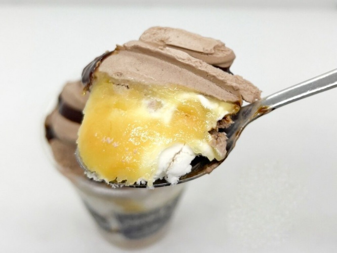 一番上はチョコレートアイスは見るからに濃厚そう。バナナソースの黄色がまた美味しそうですね。