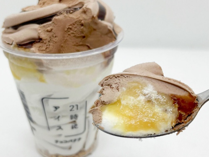 夜のリッチな締めアイスとして話題のアイスクリーム専門店「21時にアイス」。現在は全国に40店舗を展開しています。その「21時にアイス」とセブン-イレブンとのコラボが、12月23日(火)よりスタートしました。販売されるのは、お店で人気上位の味わいを表現した1個330mlのボリューム満点アイス『21時にアイス チョコバナナ』と『21時にアイス 紫芋モンブラン』です。そこで今回は『21時にアイス チョコバナナ』をいただいてみたいと思います。