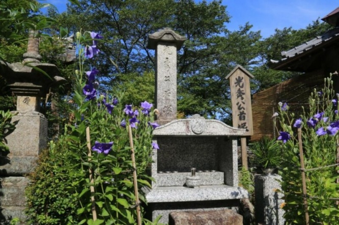その家紋にちなみ「桔梗寺」「光秀寺」とも呼ばれるのが、亀岡駅からバスで30分ほどに位置する谷性寺(こくしょうじ)です。同寺の本尊・不動明王は光秀が篤く信仰したと伝えられ、境内には光秀の首塚があります。