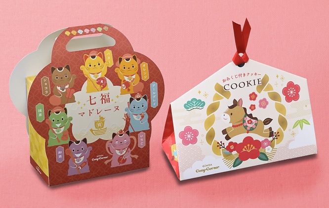 発売される焼菓子ギフトは3種。運だめしができて願いごとも書ける「おみくじ付き絵馬クッキー(10個入)」はクッキー2種を、”七福神に扮した招き猫“デザインの「七福マドレーヌバッグ(7個入)」は人気のマドレーヌ7種を、スイーツ柄ブランケットが付いた「新春福袋(28個入、グッズ付き)」はクッキー4種とマドレーヌ5種をアソート。