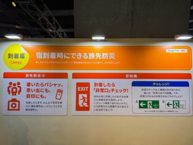 こうした課題に対応するため、“いつものスマホで、もしもに備える”をテーマに、身近なスマホで手軽に備えることができる防災対策の紹介や、旅への防災意識をチェックできる体験場『旅先防災案内所』解説。