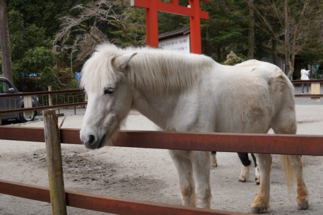 御神馬は白馬の「白雪号」。年が明けると行われる白馬神事は「白雪号」が各本宮を巡拝した後に境内を駆け巡る神事で、年の初めに白馬を見ると邪気が祓われると伝えられております。神事中は「白雪ちゃ〜ん」と声があがるそうです。