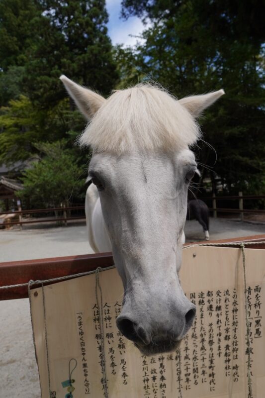 上賀茂神社に御神馬の「神山号」が奉納されるようになったのは、昭和49年(1974)から。京都産業大学馬術部が初代の「神山号」から世話しています。普段は大学グラウンドの厩舎で過ごし、お祭りのときや日曜・祝日は神社に出社するそうです。