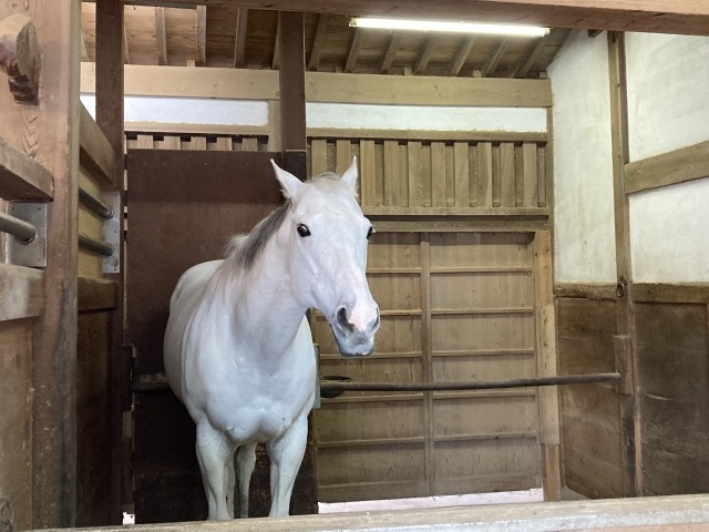 鹿児島神宮の御神馬は、白馬の「青嵐号(せいらんごう)」。2018年に日本中央競馬会(JRA)から奉納されたサラブレッドです。少々気は荒いけれども、お世話を担当してる人が会いに来ると、走って来てくれるそうです。