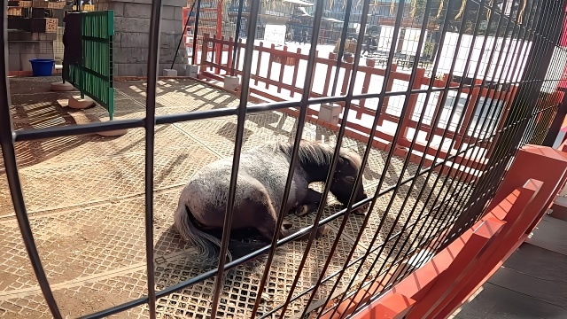 夕方5時のメロディーが町内に流れるとともに、黒ちゃんが一番上の木枠のバーの下に身体を差し入れ「よいしょ!」と背中で持ち上げて、器用にバーを外し、自分で厩舎に戻っていくのです。自由に歩いたり寝転んだりする姿に癒しと安らぎを与えてくれる二人。何度も訪れる人が多いようです。