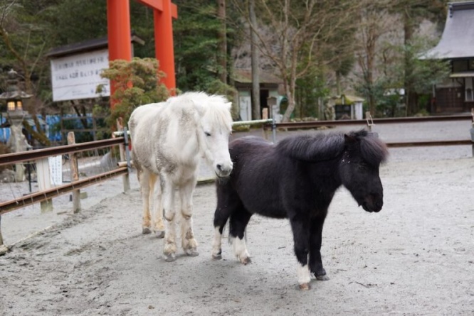 「御神馬」の小さめの黒馬「黒ちゃん」とちょっと大きめの白馬「白ちゃん」が暮らしているのは下社。赤い鳥居の横にある木枠で作られた囲いの中にいて、人々を迎えてくれます。