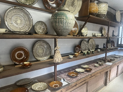 ●小鹿田焼が生まれる里へ小鹿田焼の里は、大分県日田市内から車で約20分の山あいにあります。伺った黒木昌伸さんの工房では、小鹿田焼を販売している店舗の横に作業場があり、窯に入れる前の器が並んでいる奥で黒木さんが実際にろくろを回していました。