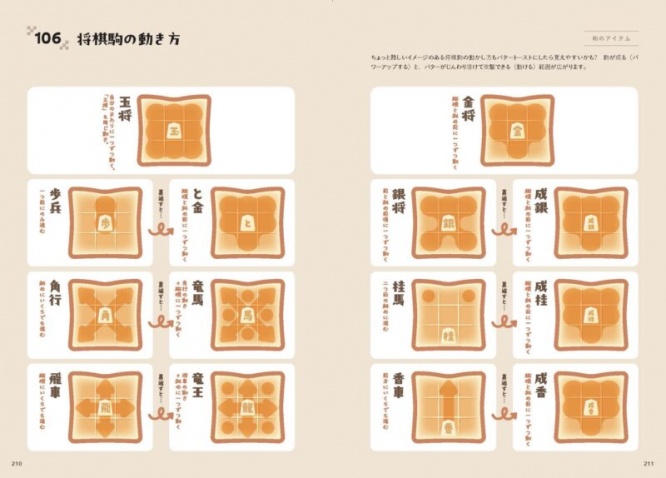 例えば「誕生石の和名」というテーマでは、誕生石をトランプモチーフに見立てた図解に。「将棋の駒の動き方」というテーマでは盤面をトーストに、駒の動きをバターの溶け方に見立てた図解になっています。そのほかにも、「空模様×窓辺」「月の満ち欠け×キャンドル」など様々な組み合わせで紹介しているため、そういった図解のアイデアもあわせて楽しめます。