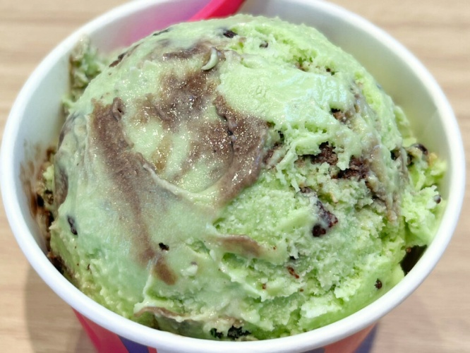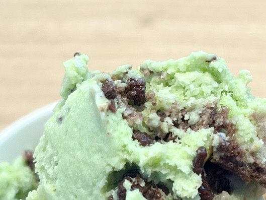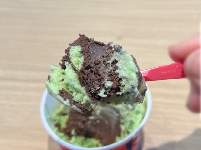 カラメルの香ばしさを感じるビターなチョコレートアイスに、コクのあるピスタチオの風味が絶妙にマッチ!ピスタチオのアイスにはホワイトチョコレートもミックスされていて、味わいに奥深さを与えていました。