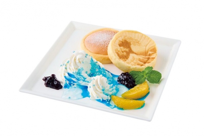葛飾北斎の有名な浮世絵「神奈川沖浪裏」をイメージした一皿。大波を表すホイップクリームとブルーベリーソースがパンケーキを引き立てます。