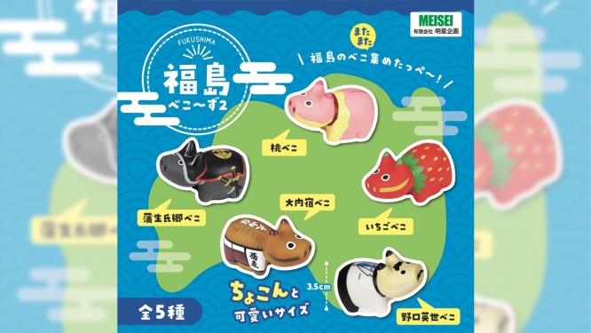 ラインナップは、福島各地の“名所・人物・名物”をテーマにした、ももべこ、野口英世べこ、蒲生氏郷べこ、大内宿べこ、いちごべこの全5種。
