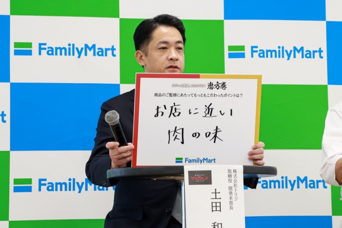 土田氏は「焼肉トラジ監修 牛焼肉恵方巻」のこだわりは「牛カルビ焼肉の肉の旨味」と発表。また「牛焼肉とキムチというシンプルなマッチングですが、使用する部位や味付け、焼き方まで細かくこだわりました。隠し味に魚介や昆布だしを加えて、一味ちがうキムチもポイントです」と商品の特徴を述べた。