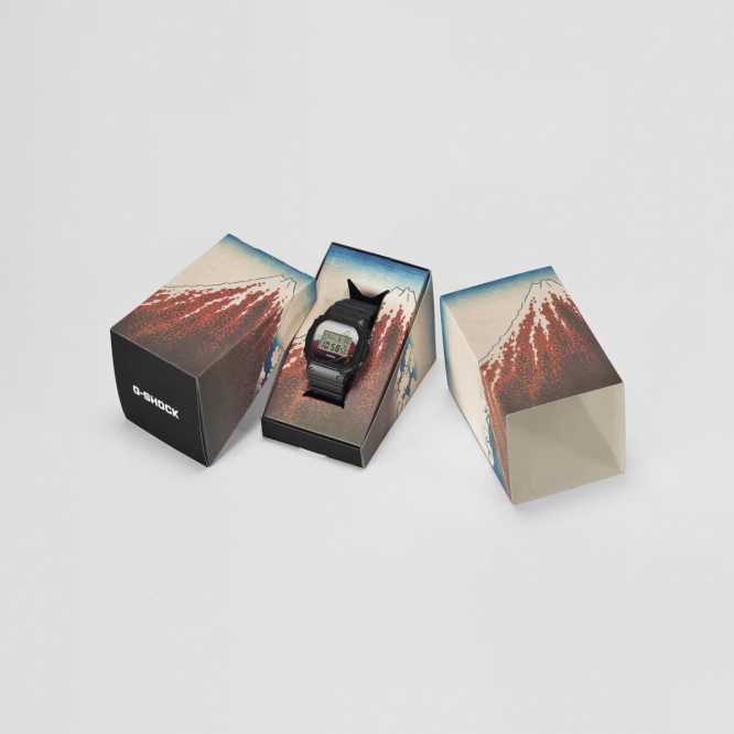 北斎の代表作である富嶽三十六景の中から「深川万年橋下」を採用したモデル。ベースモデルにはアイコニックな定番デジタルDW-5600を採用し、文字板には「深川万年橋下」を大胆にデザイン。