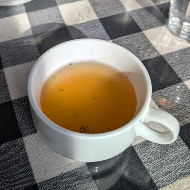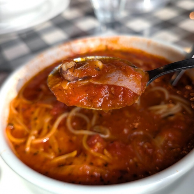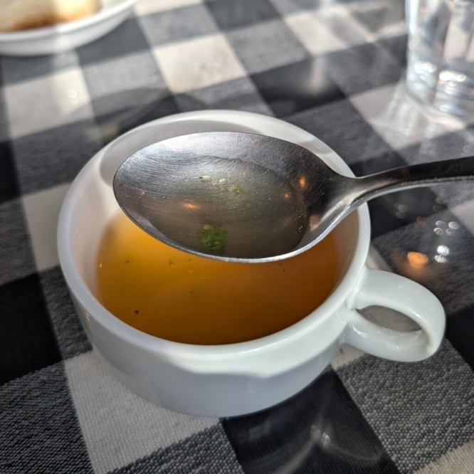 スープはコンソメベースのオニオンスープで、さっぱりとしたやさしい味わい。