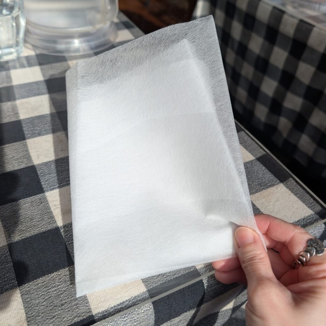 紙エプロンがもらえるので安心いよいよ登場した「真夜中のスパゲティ」は、少し辛味のあるガーリックトマトスープ仕立て。魚介と野菜の旨味が溶け込んだスープにパスタが絡み、口に運んだ瞬間、ガーリックとトマトの風味が一気に広がります。思わず「これが真夜中のスパゲティか」と納得してしまう、記憶に残る味。