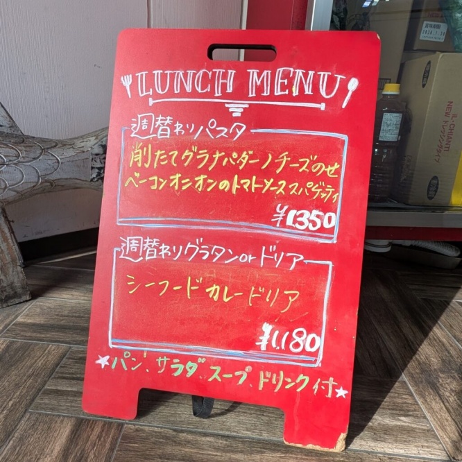 ランチメニューは定番パスタに加え、週替わりのグラタンやドリアなど種類が豊富。平日限定のランチセットは特に人気で、パスタにパン、スープ、サラダ、ドリンクが付いて1,000円台からと、価格帯も魅力です。ディナータイムにはアラカルトやコース料理が充実し、落ち着いた雰囲気でゆっくりと食事を楽しむこともできます。