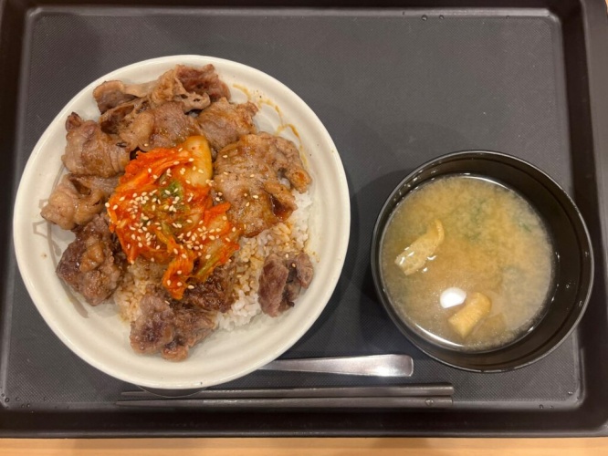 こちらが『カルビと特選ブリスケット肉の合い盛り丼』。今なら普通盛りも大盛りも同じ価格とのことで、大盛りにしました。