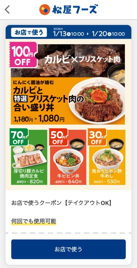 サッとご飯を済ませたい時にも便利なお店ですが、「松屋フーズ公式アプリ」を使えばお得に人気メニューをいただくことができるんです。しかもクーポンを使うだけなら登録は不要。アプリを入れるだけ!